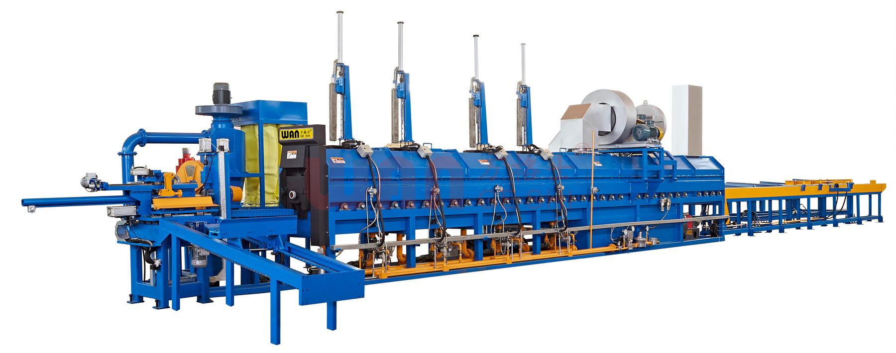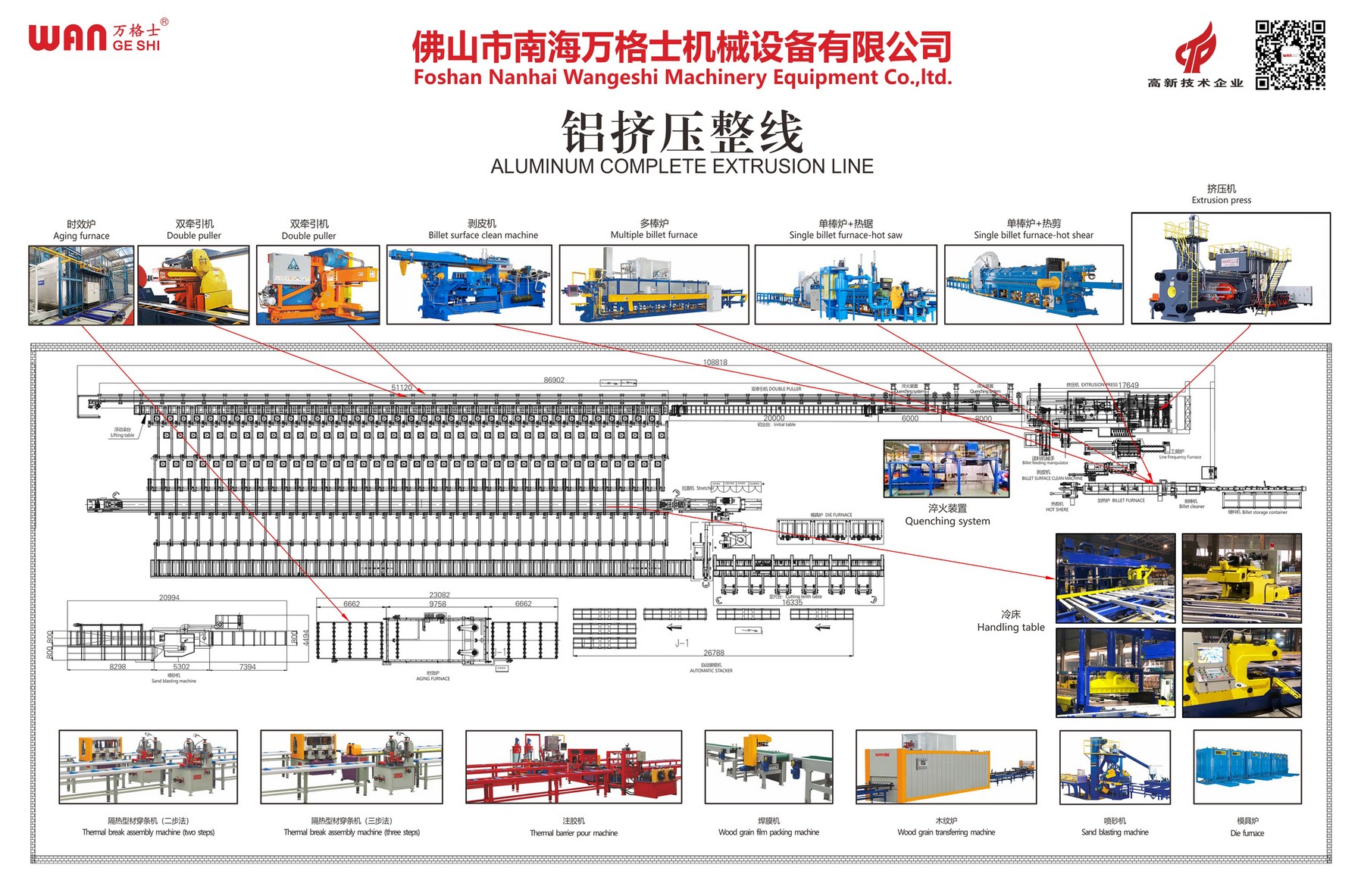 鋁擠壓整線中的淬火裝置位于模具出口后端,是生產(chǎn)高端鋁合金型材的關(guān)鍵設(shè)備。其核心作用是對(duì)高溫?cái)D壓成型的型材進(jìn)行急速、均勻的冷卻(通過風(fēng)冷、水霧或噴水等方式),以此固定合金元素的過飽和狀態(tài),為后續(xù)的時(shí)效熱處理做好準(zhǔn)備。